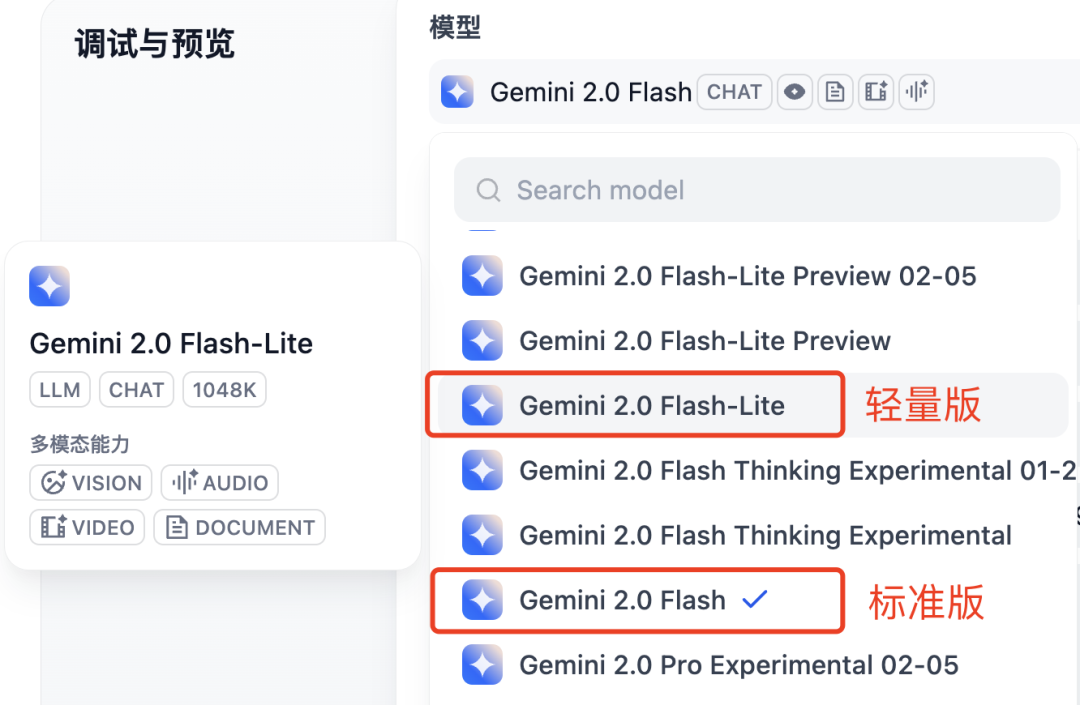 模型添加成功后,可以看到 Gemini 也支持非常多不同的大模型,比如标准版和 Lite 轻量版。