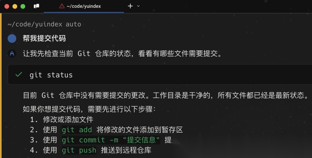 想提交代码或部署项目,可以使用 Warp AI,自动帮你把自然语言转换为正确的命令并执行,再也不用记忆复杂的命令,简化了终端操作。