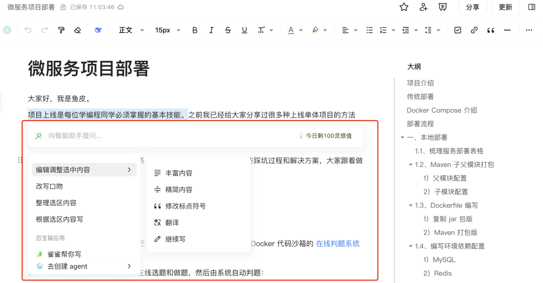 团队协作文档我用的比较多的还是语雀,本身功能就比较丰富,Markdown 语法写文章、嵌入画板等工具、一键进入演讲模式等等。现在它内嵌了 DeepSeek 大模型和 AI 助手功能,可以帮你快速完善丰富指定内容、改写口吻、总结转写内容,做笔记也是比较合适的。