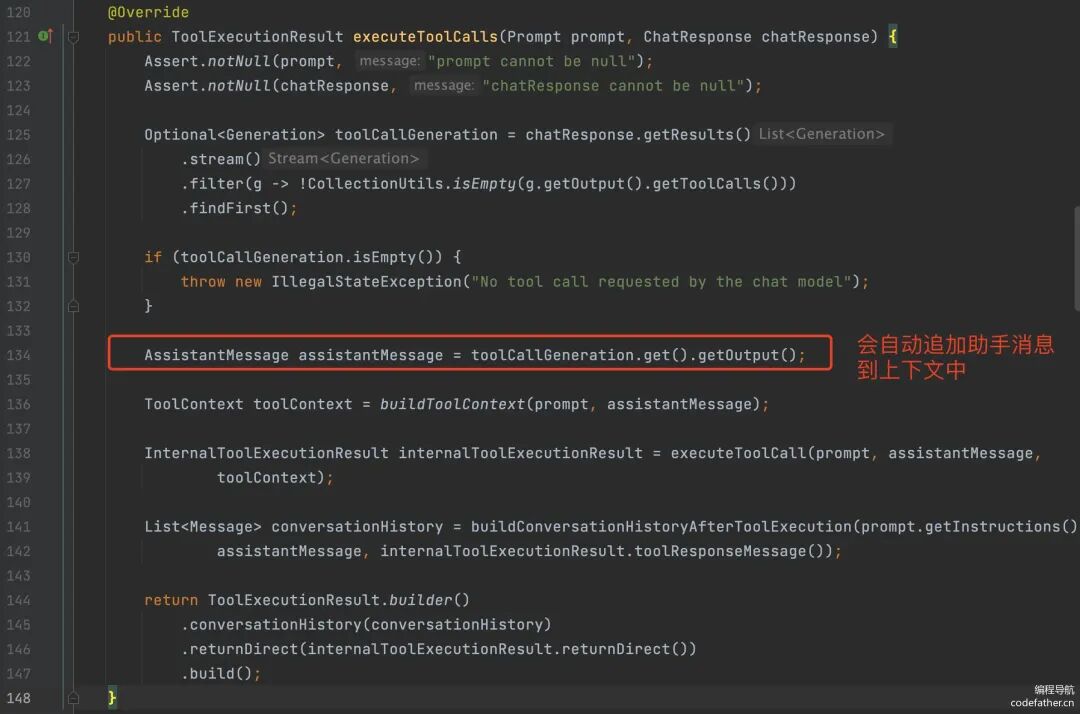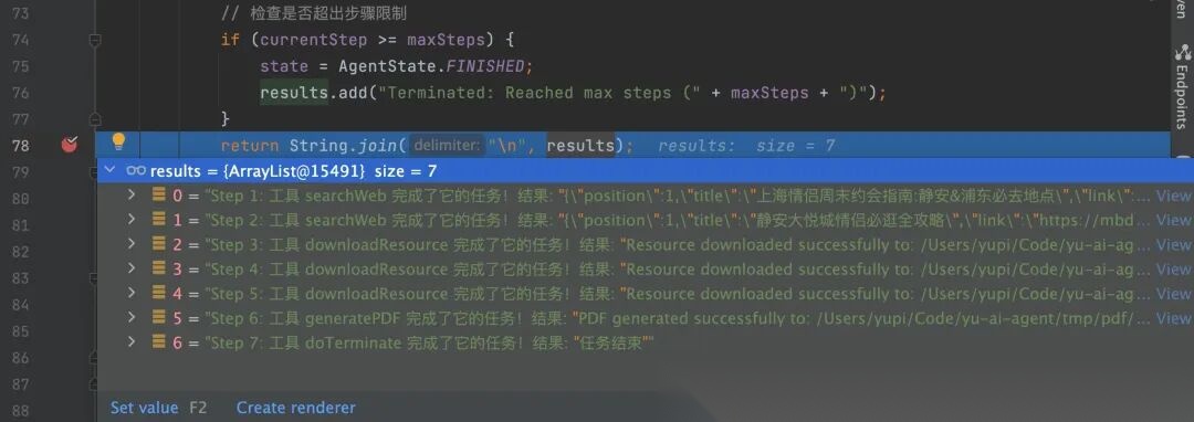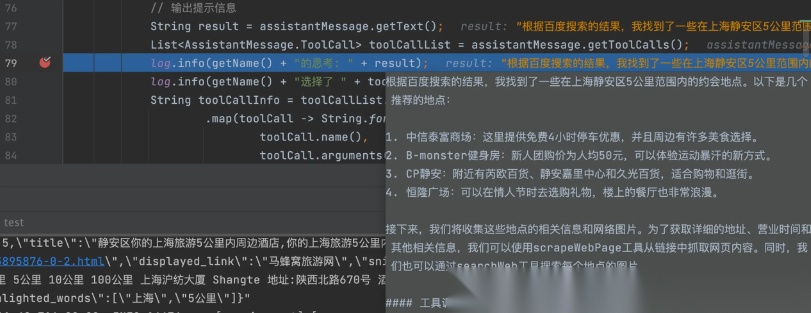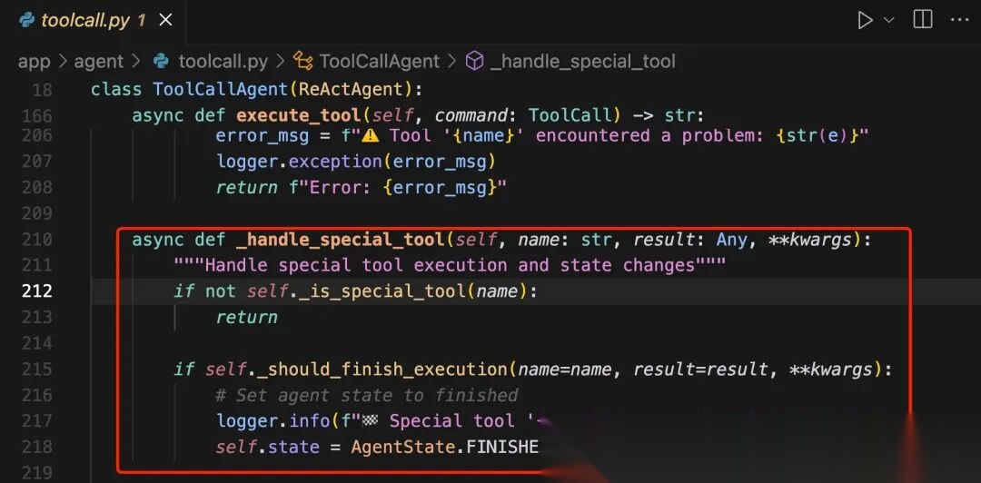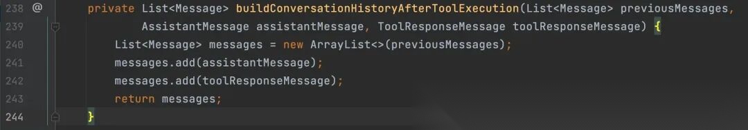 // 当前工具调用的结果 ToolResponseMessage toolResponseMessage = (ToolResponseMessage) CollUtil.getLast(toolExecutionResult.conversationHistory()); String results = toolResponseMessage.getResponses().stream() .map(response -> "工具 " + response.name() + " 完成了它的任务!结果: " + response.responseData()) .collect(Collectors.joining("\n")); // 判断是否调用了终止工具 boolean terminateToolCalled = toolResponseMessage.getResponses().stream() .anyMatch(response -> "doTerminate".equals(response.name())); if (terminateToolCalled) { setState(AgentState.FINISHED); } log.info(results); return results;