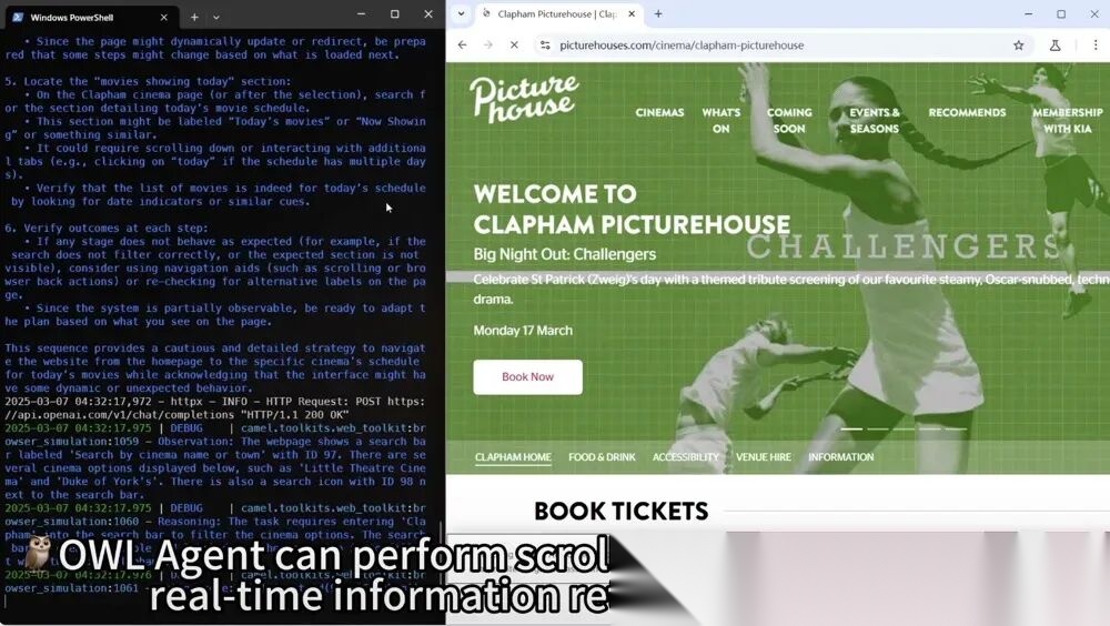 下图是官方介绍的 Demo,OWL 可以自动打开我们的浏览器访问网页,执行滚动、点击、打字操作,并且实时抓取网页信息:
