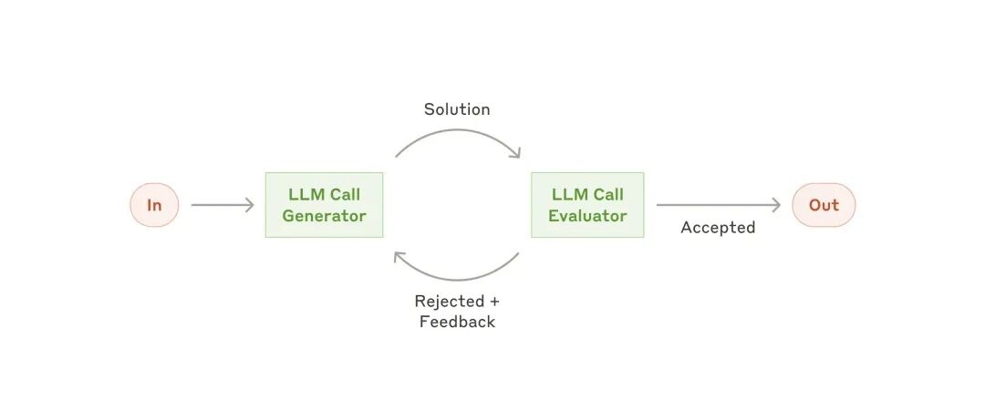 Evaluator-Optimizer 模式模拟了人类 “写 => 评 => 改” 的过程。一个智能体负责生成初步结果,另一个智能体负责评估和反馈,二者循环迭代优化输出