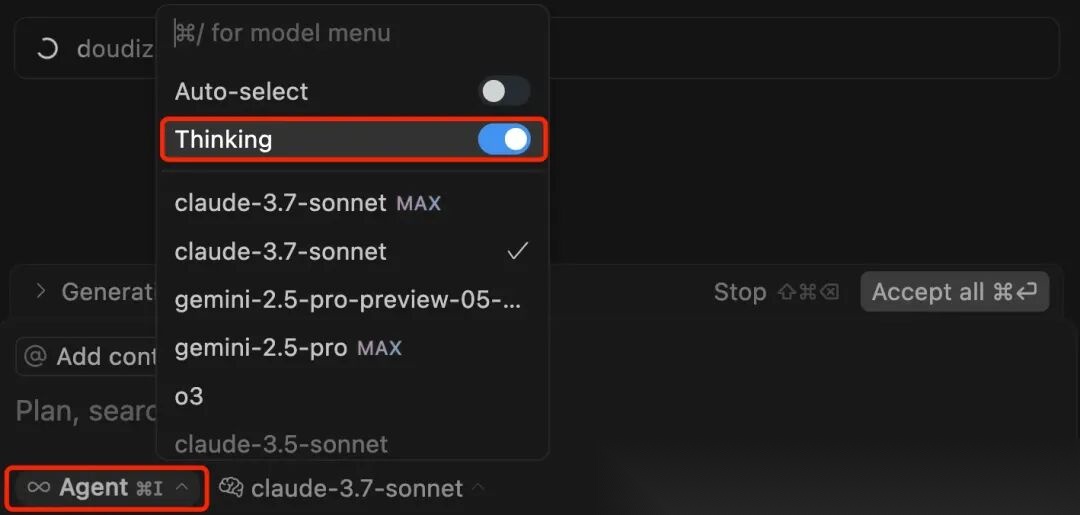 AI 开发工具 Cursor、tare 就集成了 AI 智能体,可以帮我们生成完整的项目代码、或者解释项目代码。选择 Agent 模式就可以直接使用了,建议同时开启 Thinking 深度思考: