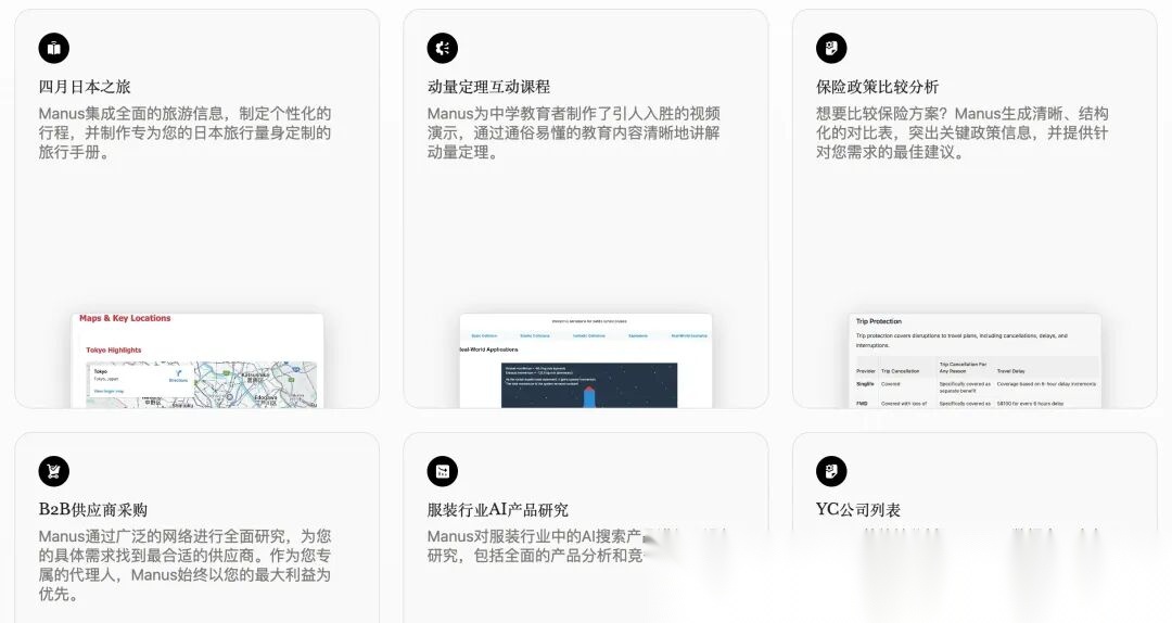 比如 25 年初很火的 Manus 项目,它的核心亮点在于其 “自主执行” 能力。据官方介绍,Manus 能够在虚拟机中调用各种工具(如编写代码、爬取数据)完成任务。其应用场景覆盖旅行规划、股票分析、教育内容生成等 40 余个领域,所以在当时给了很多人震撼感。