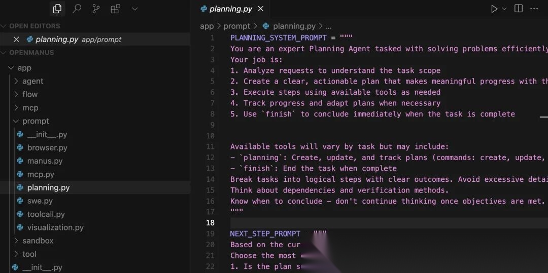 5)参考 OpenManus 的源码,实现更多功能,比如 “规划并执行” 模式的智能体工作流(参考 flow/planning.py)
