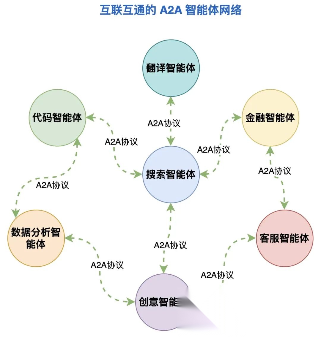 A2A 协议的核心,是让每个智能体都能像 “网络节点” 一样,拥有自己的身份、能力描述和通信接口。它不仅规定了消息的格式和传递方式,还包括了身份认证、能力发现、任务委托、结果回传等机制。这样一来,智能体之间就可以像人类团队一样,互相打招呼、询问对方能做什么、请求协助。