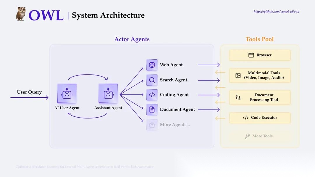OWL (Optimized Workforce Learning) 是由 CAMEL-AI 团队开源的一款面向 多智能体协作与真实世界任务自动化 的前沿框架。通过 OWL,AI 智能体可以执行终端命令、访问网络资源、运行各种编程语言的代码、使用各种开发工具等等。