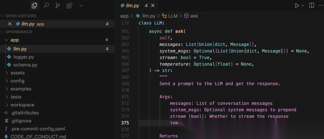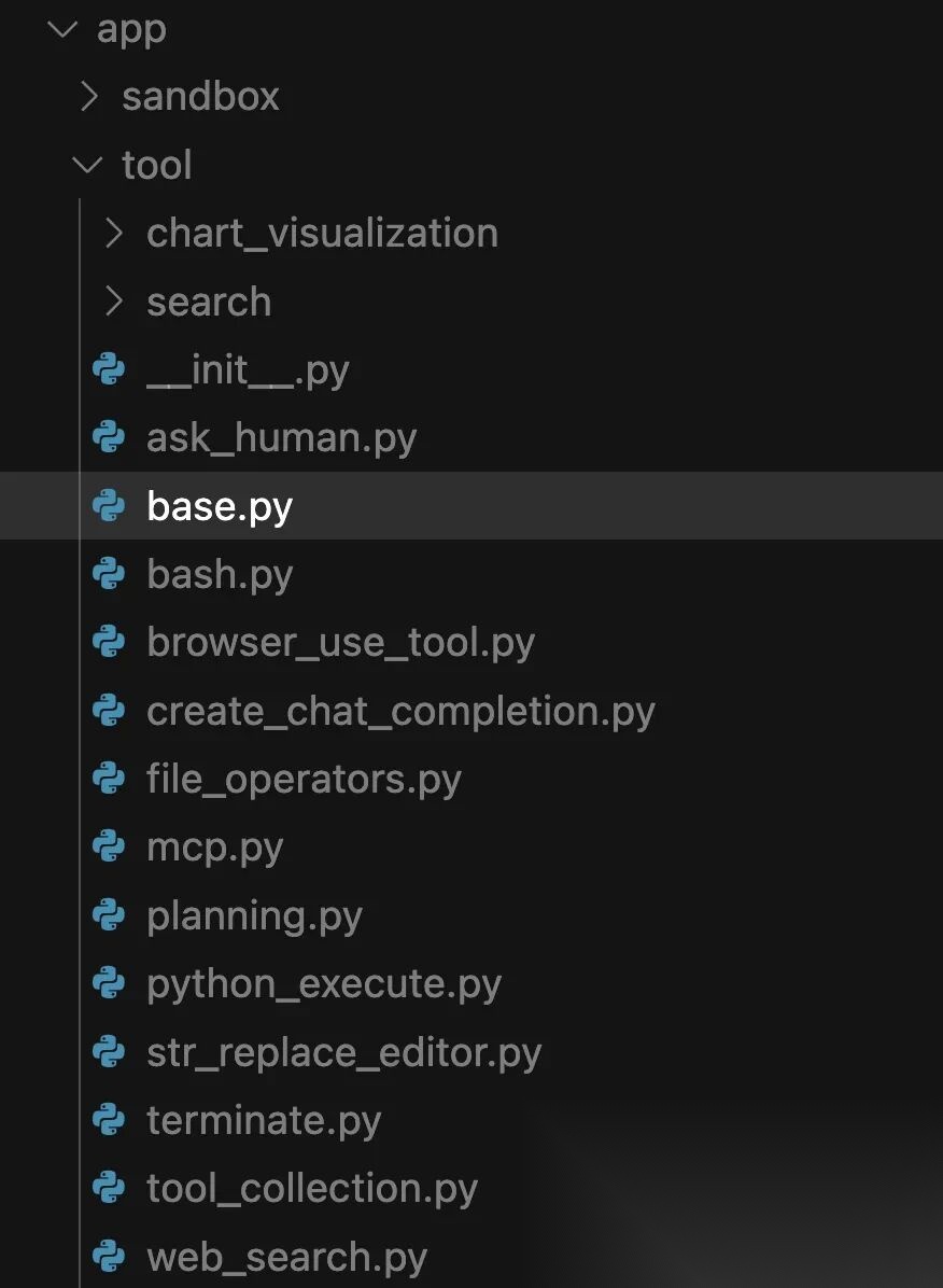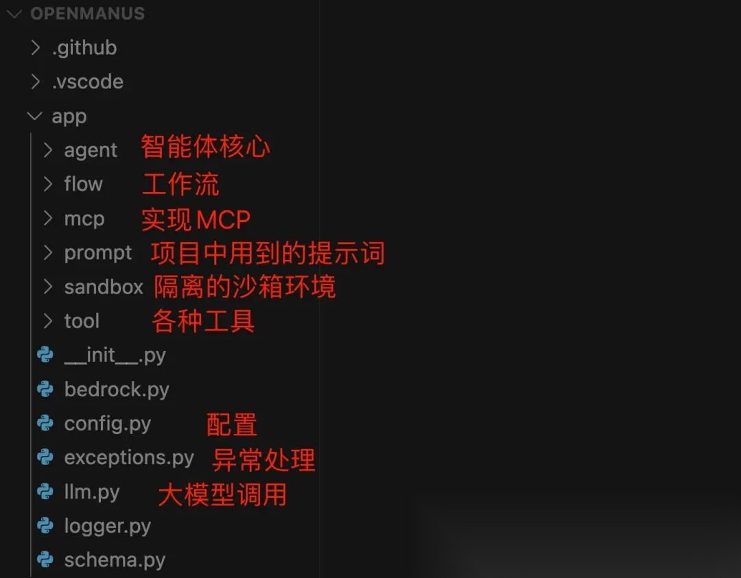了解了 OpenManus 的核心功能后,先 从整体到局部 地观察 OpenManus 的架构,简单来说就是看文件夹的组织形式、文件的命名规则、以及文件之间的关联,暂时不用深入源码。