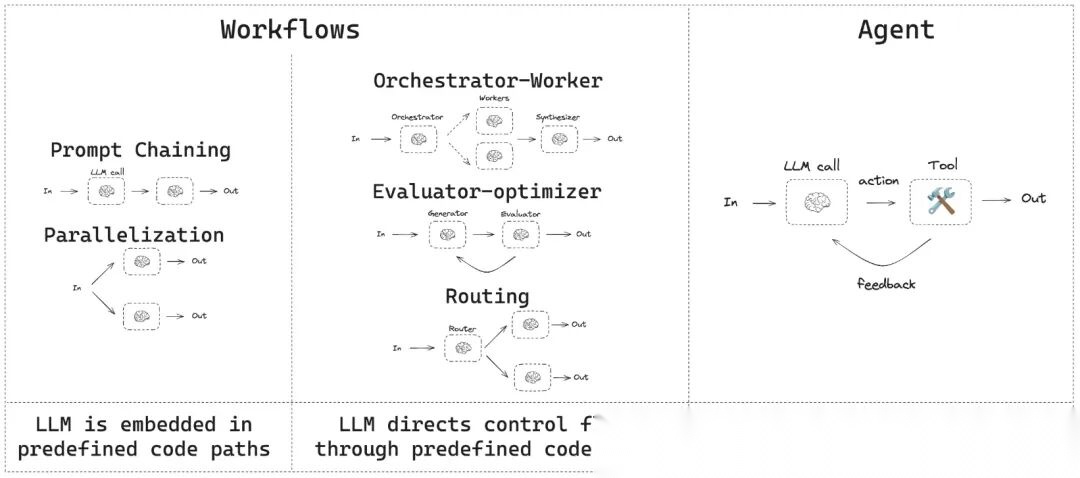 Anthropic 曾经在一篇 研究报告《Building effective agents》 中提到了多种不同的智能体工作模式,大家需要了解每种模式的特点和适用场景。