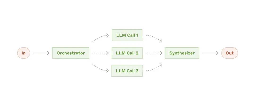 对于复杂的任务、参与任务的智能体增多时,我们可以引入一位 “管理者”,会根据任务动态拆解出多个子任务,并将这些子任务分配给多个 “工人” 智能体,最后再整合所有工人的结果。这种中央协调机制提高了复杂系统的整体效率,适合任务结构不确定、需要动态分解的复杂场景。