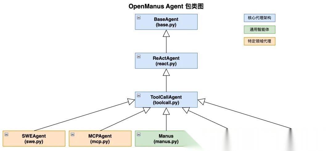 agent 目录是 OpenManus 实现的核心,采用了分层的代理架构,不同层次的代理负责不同的功能,这样更利于系统的扩展。