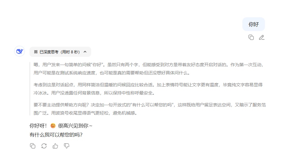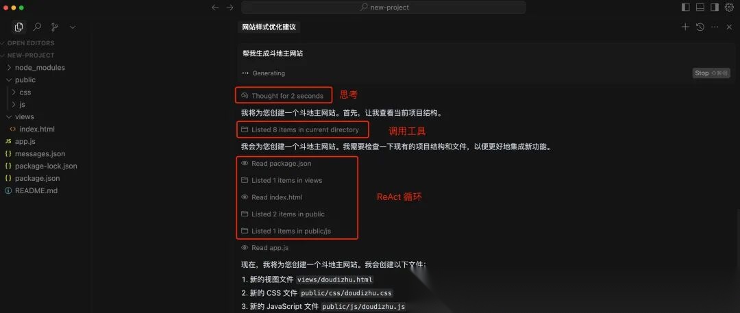 运行效果如图,典型的 CoT + Agent Loop + ReAct 模式: