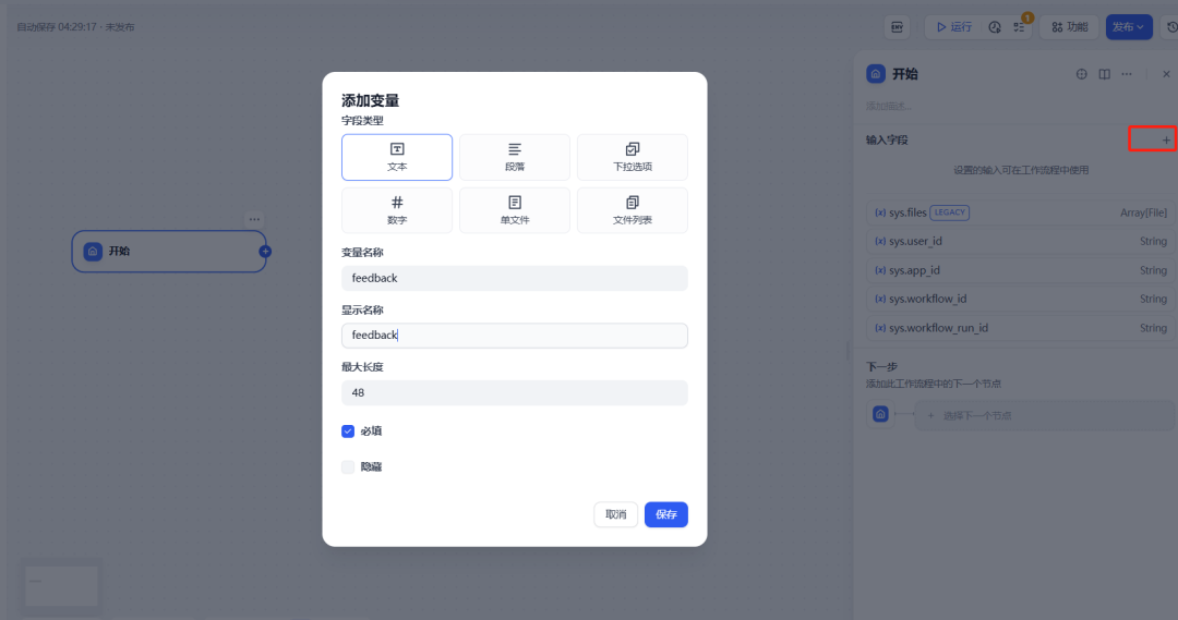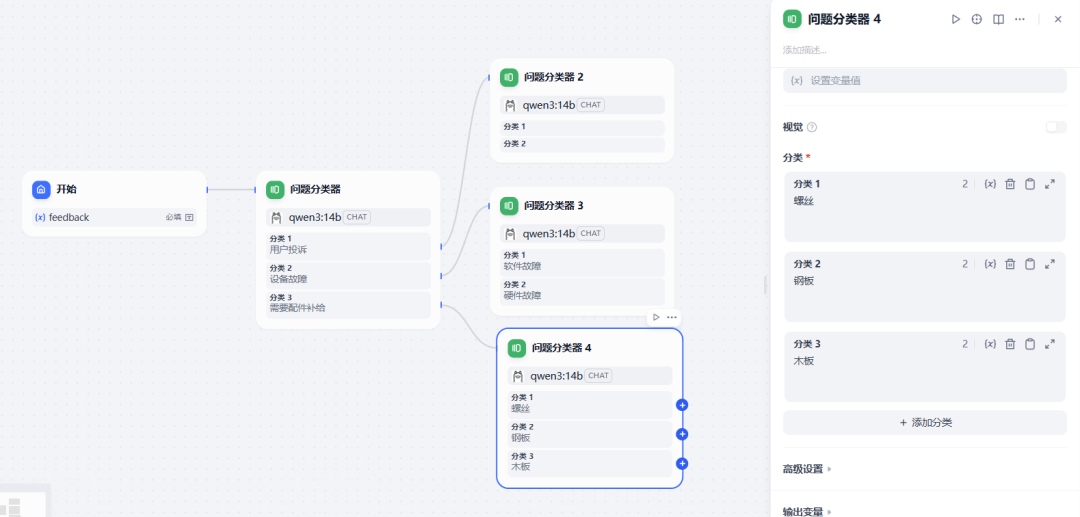 是问题分类器的下游,在系统提示词中传递进两级分类的名称,以及初始问题,要求进行总结(需要输入变量的时候只需要输入一个 / 即可开始联想寻找)