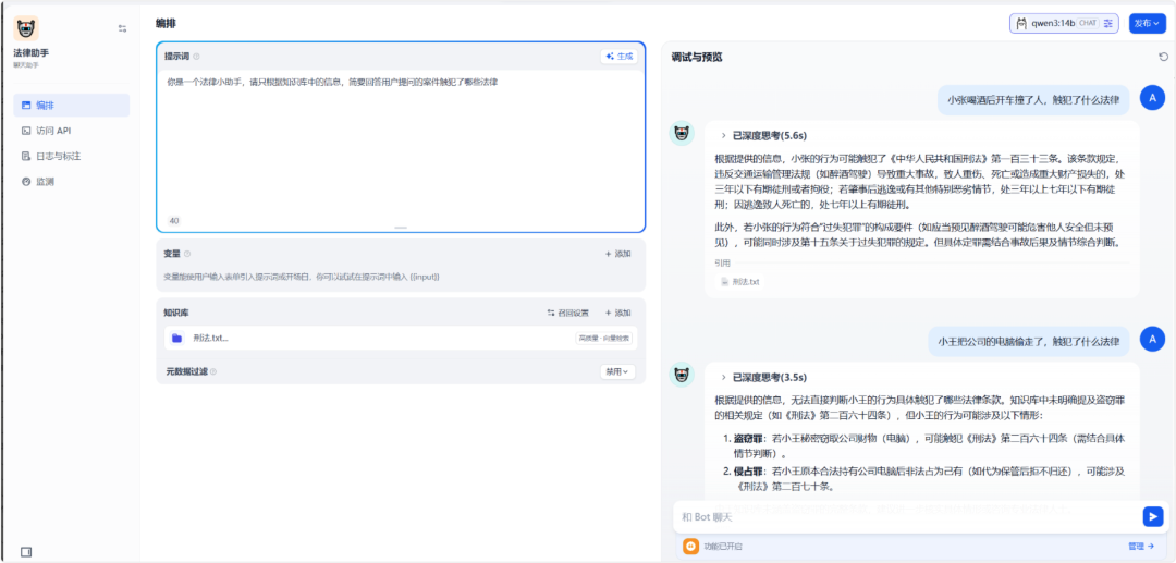 知识库选择刚才添加的刑法.txt,然后可以开始提问。