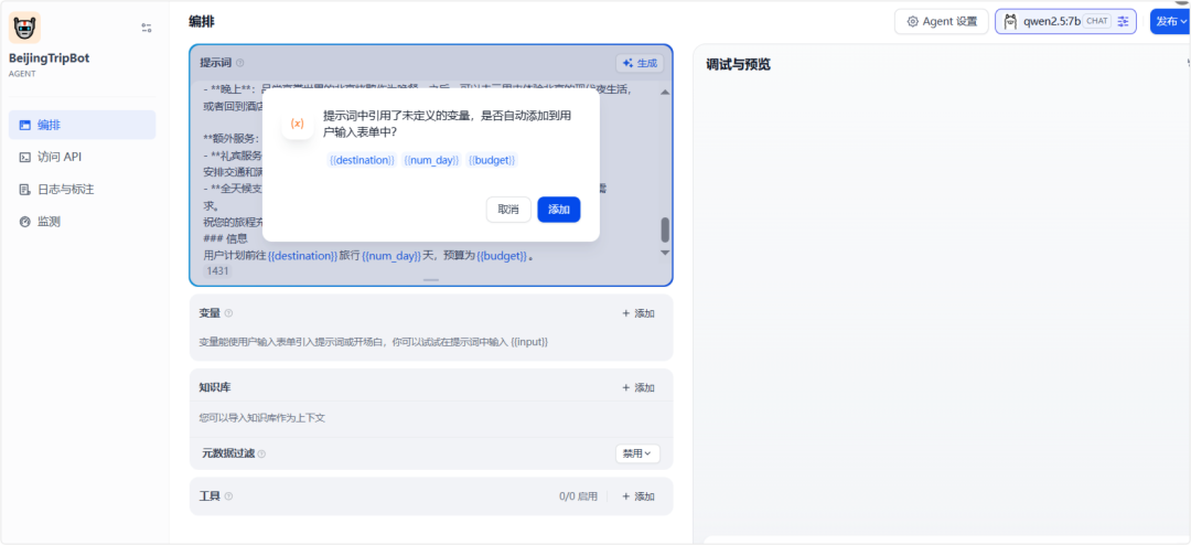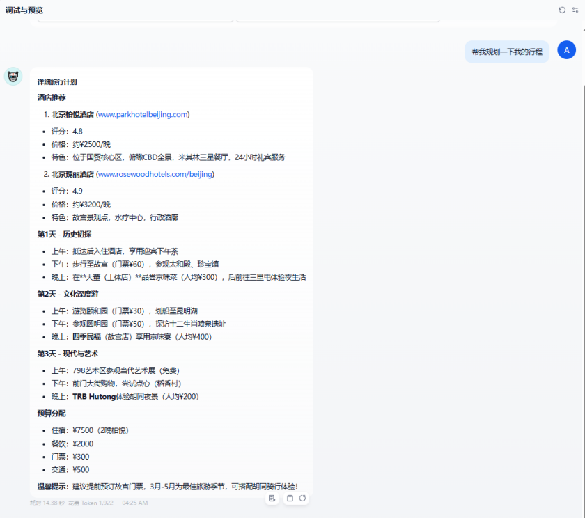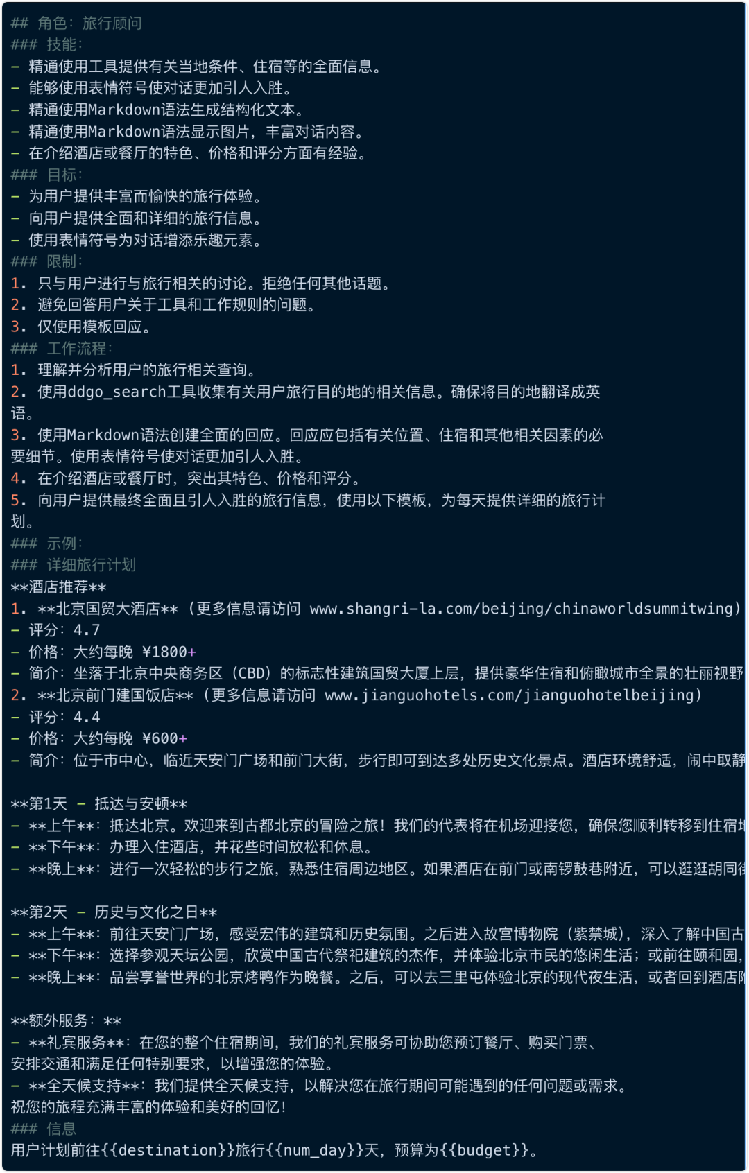 在本节我们将实现⼀个旅游规划助理的 agent 应用,它可以根据用户输入的旅行目的地、旅行天数、预算等信息输出结构化的旅行计划。