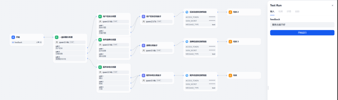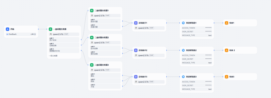 我们这里构建一个使用了钉钉群机器人的消息反馈工作流。将用户的文字问题进行分类和拆解分析后通过钉钉群机器人发送到群中。【企业微信 webhook 同理】