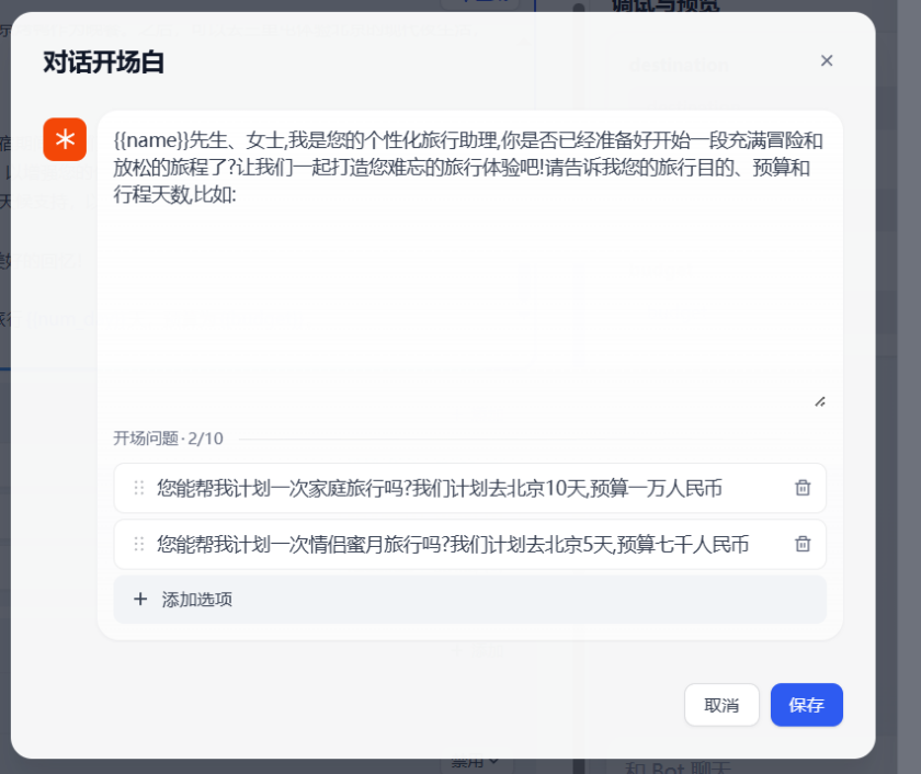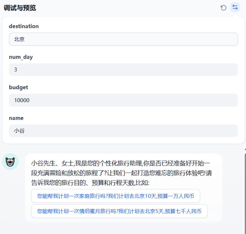 {{name}}先生、女士,我是您的个性化旅行助理,你是否已经准备好开始一段充满冒险和放松的旅程了?让我们一起打造您难忘的旅行体验吧!请告诉我您的旅行目的、预算和行程天数,比如:您能帮我计划一次家庭旅行吗?我们计划去北京10天,预算一万人民币您能帮我计划一次情侣蜜月旅行吗?我们计划去北京5天,预算七千人民币
