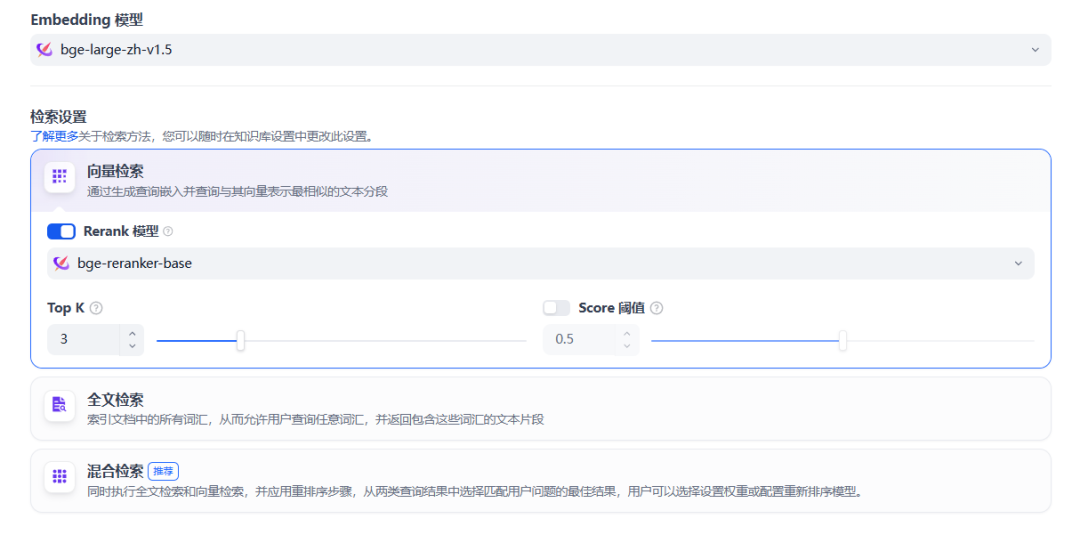 在这里可以选择Embedding模型和Rerank模型,也可以设置Top K,也就是选出最相似的前n条。选择Score阈值,即筛选文本的相似度阈值。