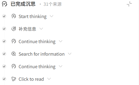我们可以看到模型在调用搜索引擎,不断的搜索、思考、再搜索再思考。循环往复,直到它收集到足够多的信息。