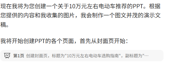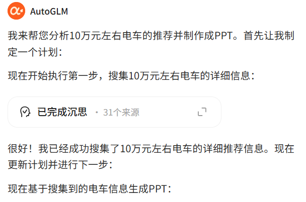 模型首先对任务进行了分解,先搜集电车的详细信息,然后根据信息生成PPT, 注意,在提示词中并没有指定模型生成PPT。做PPT是模型自己思考的结果。