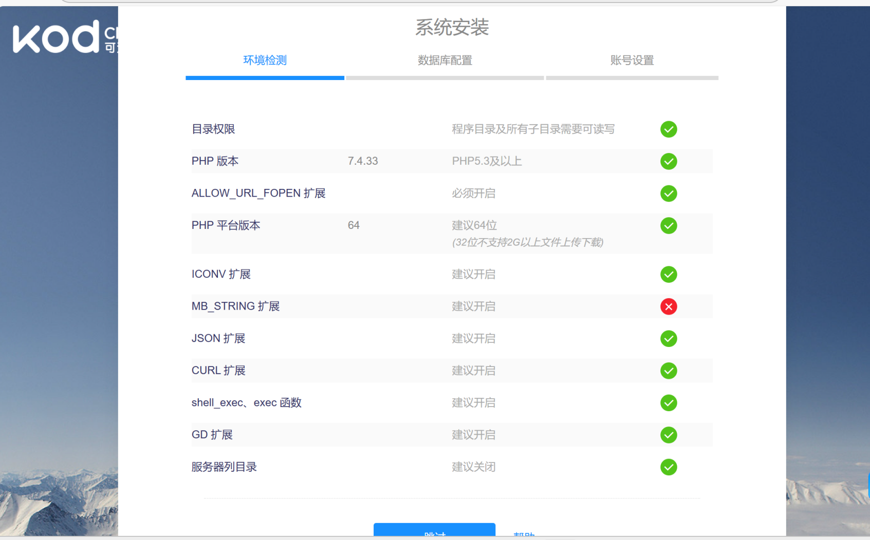操作完之后,然后再访问kod的时候你就会发现(MB_STRING拓展没有装)
