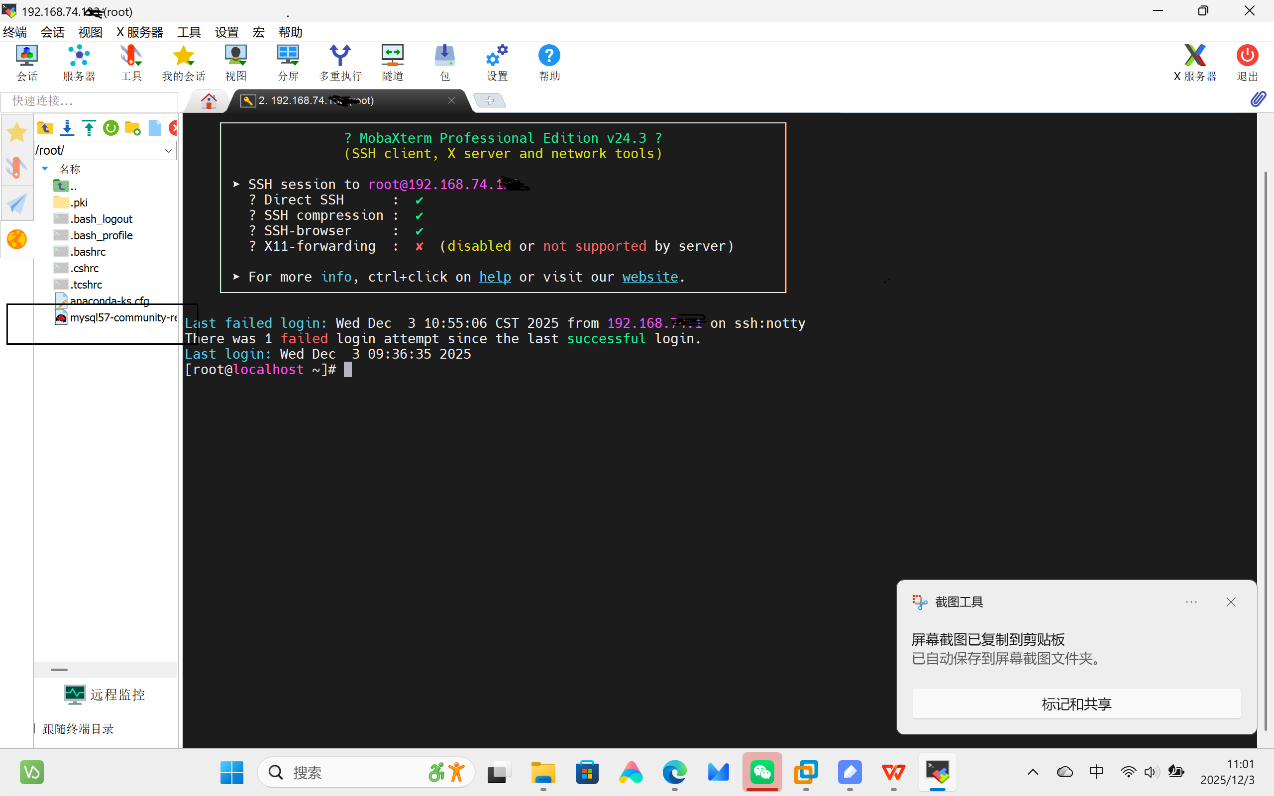 (2)然后使用第三方工具,(我用的是MobraXterm)将其传到Centos7 /root/目录下