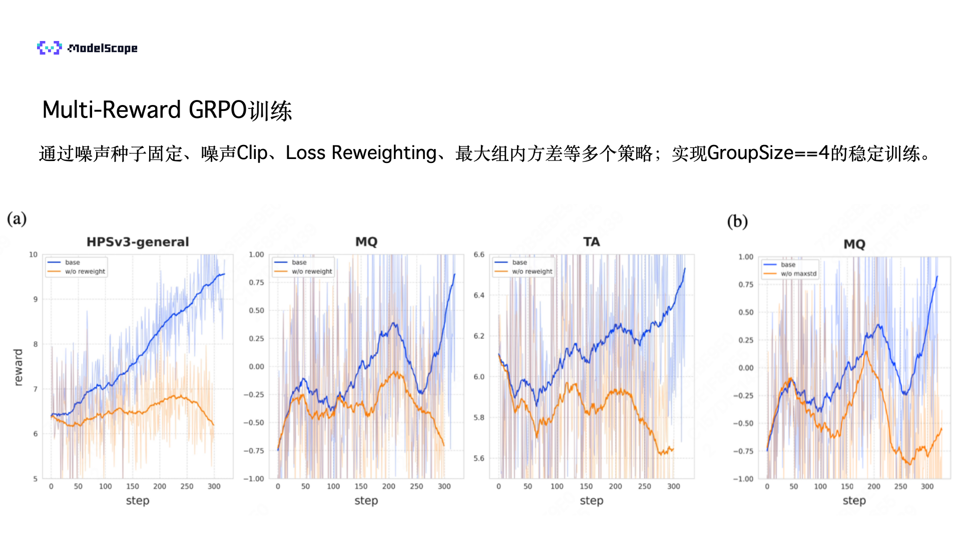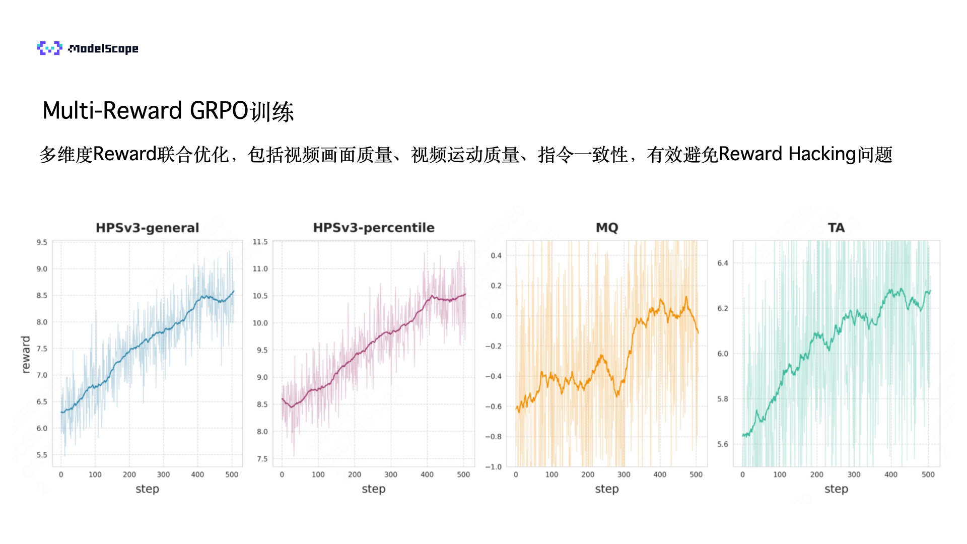 我们实现了多维度联合优化,涵盖图像质量、内容一致性、动态效果(Motion Quality)等维度,且训练过程中奖励值(Reward)稳定上升。为实现这一目标,我们制定了一系列训练策略,最终发现分组尺寸设为4时,即可实现稳定训练。这对视频生成这类高计算成本任务而言意义重大。
