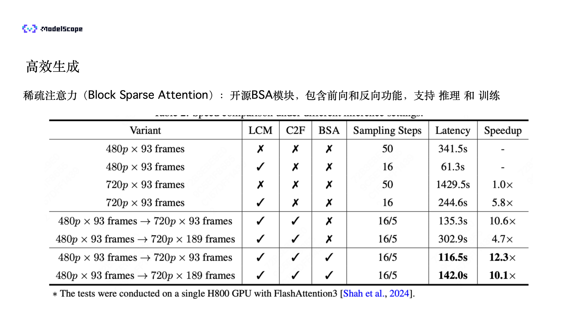 针对长视频生成,我们引入稀疏注意力机制,可额外提供近两倍加速。该模块已完整开源,包含前向与反向实现代码,开发者与社区同学可直接用于训练与推理场景。