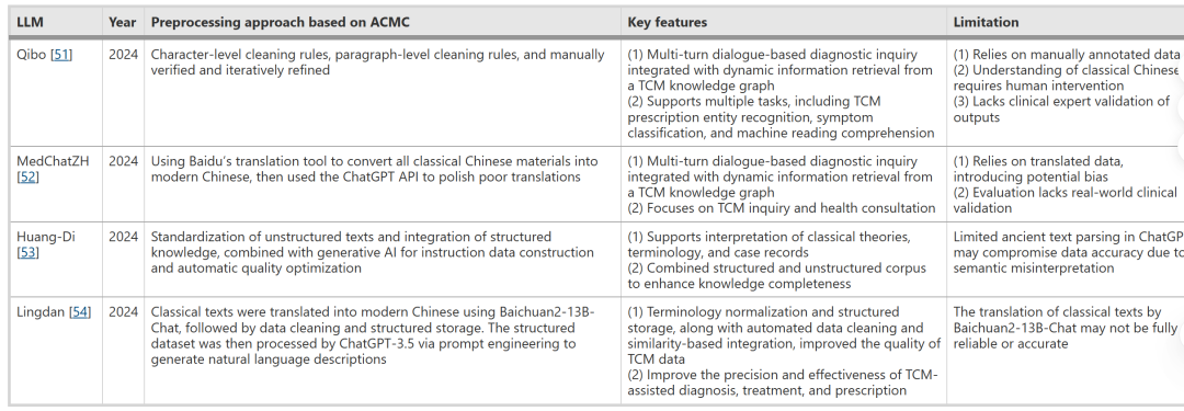 [表2:整合ACMC训练的中医LLMs核心特征比较分析]