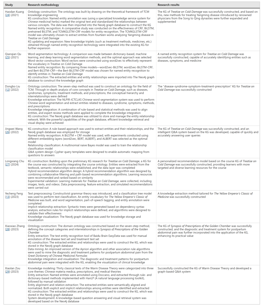 - 张一卓等采用本体七步法构建《伤寒论》本体,为知识图谱构建提供概念模型和逻辑基础