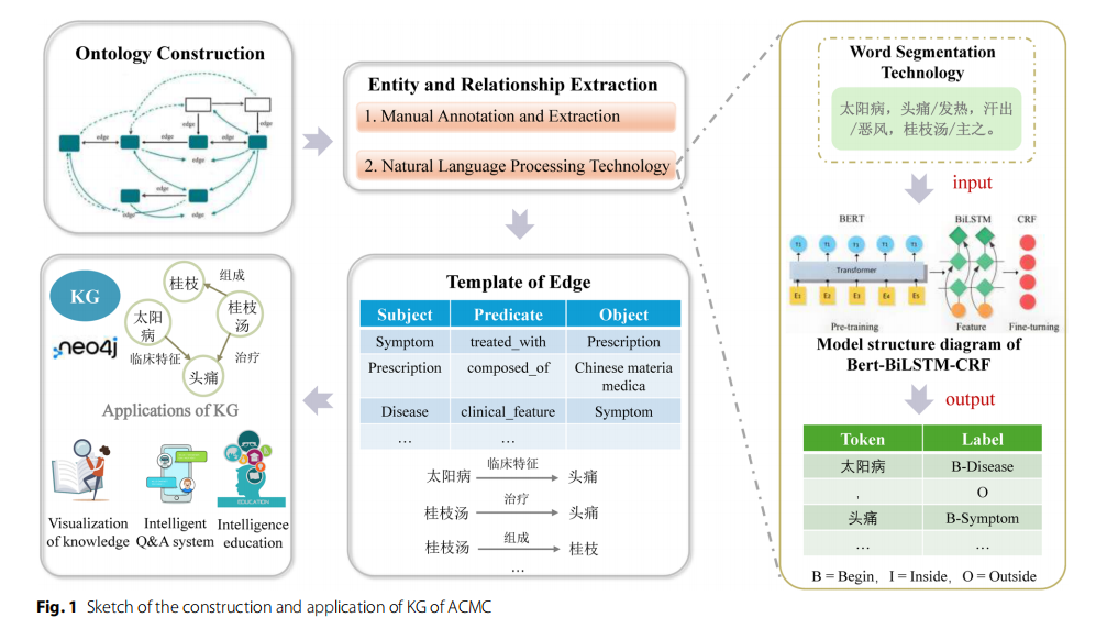 知识图谱通过将数据清洗、标注和存储整合到统一流程中,促进了ACMC知识的标准化表示、数字化存储和检索 。在整合不同历史时期的经典文本时,知识图谱有助于阐明ACMC的发展轨迹,增强经典医学知识源之间的内在联系 。
