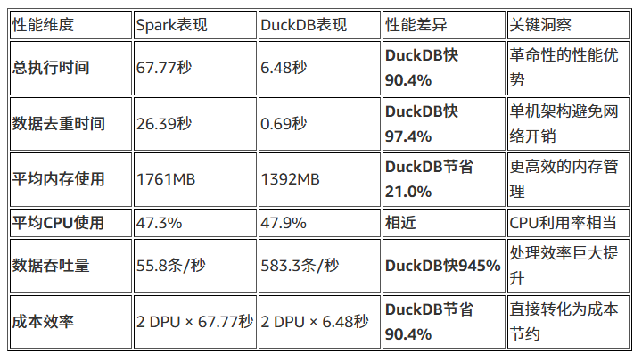 - DuckDB的去重操作比Spark快97.4%,体现了列式存储优势
