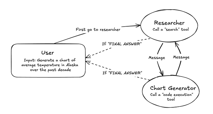 层级式团队架构源于这样一个理念:“如果单个智能体不足以完成特定任务该怎么办?” 在这种情况下,不再是由一个主管智能体协调多个智能体,而是由一个主管智能体协调多个由多个智能体组成的团队。
