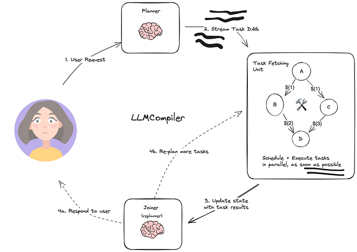 LLMCompiler 是一种agent架构,旨在通过在有向无环图 (DAG) 内执行预先加载的任务来加速agent任务的执行。它还通过减少对 LLM 的调用次数来节省冗余令牌的使用成本。以下是其计算图的概述: