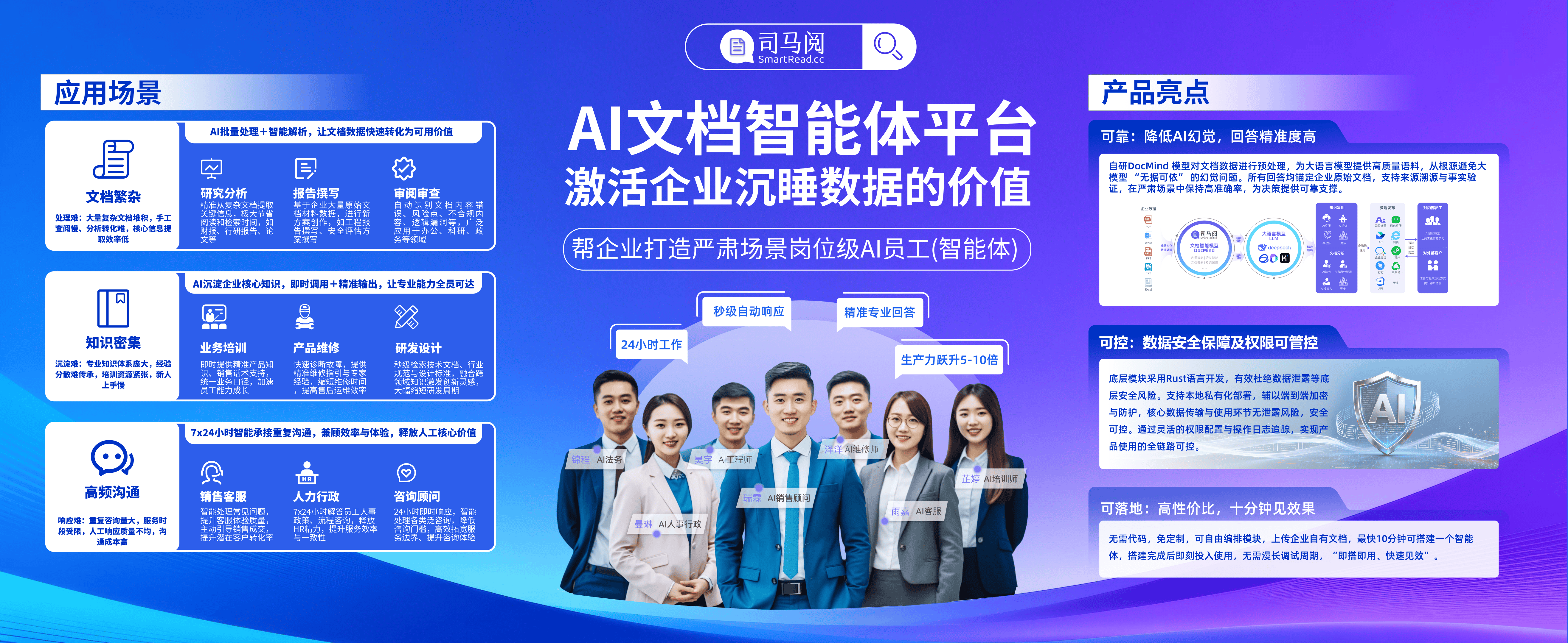 基于自研文档智能模型DocMind(已获国家模型备案),司马阅开发了国产领先的AI文档智能体平台(AI员工),助力企业严肃场景AI落地,将企业大量非结构化文档数据转化为"大模型可理解"的标准化数据,有效控制大模型幻觉,AI回答更精准、更落地。目前该平台已落地服务上百家企业客户,已服务了招投标、广告营销、工程监理、电信通讯、生产制造、物流供应链、食品、宠物医疗、法律等行业。