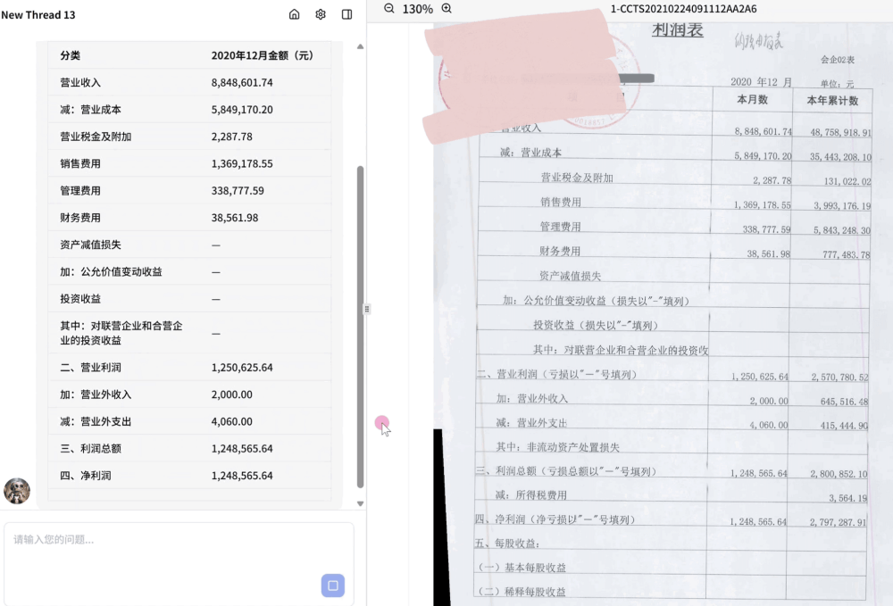 企业在AI文档智能体平台创建财务报表处理AI员工,并上传利润表扫描件,AI员工有效识别表格中关键信息(营业收入、营业利润等),完整提取当月的营业信息。