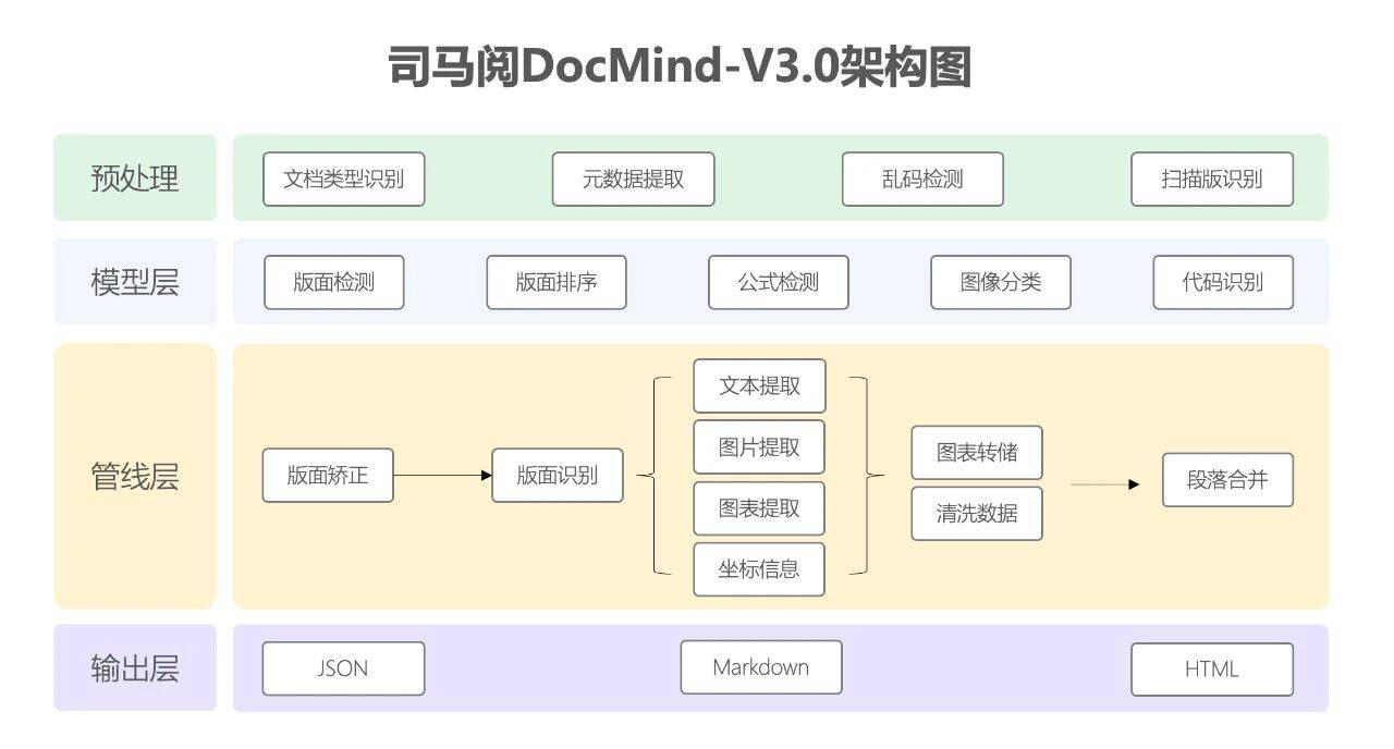 DocMind-V3.0以“预处理 → 模型层 → 管线层 → 输出层”四层结构实现数据从非结构化到结构化的闭环。