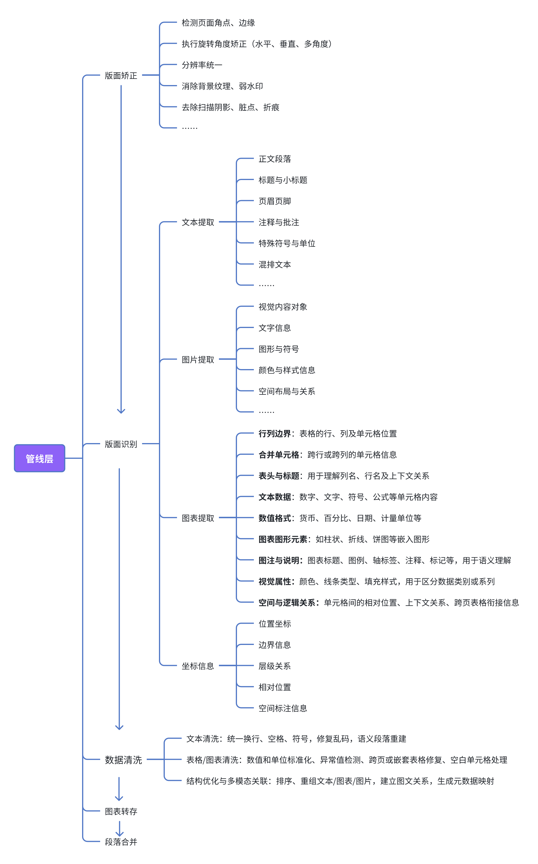 表格列标题、流程箭头、条款层级等信息必须精确识别,文档需“拆解—归位—重建”才能被机器理解。