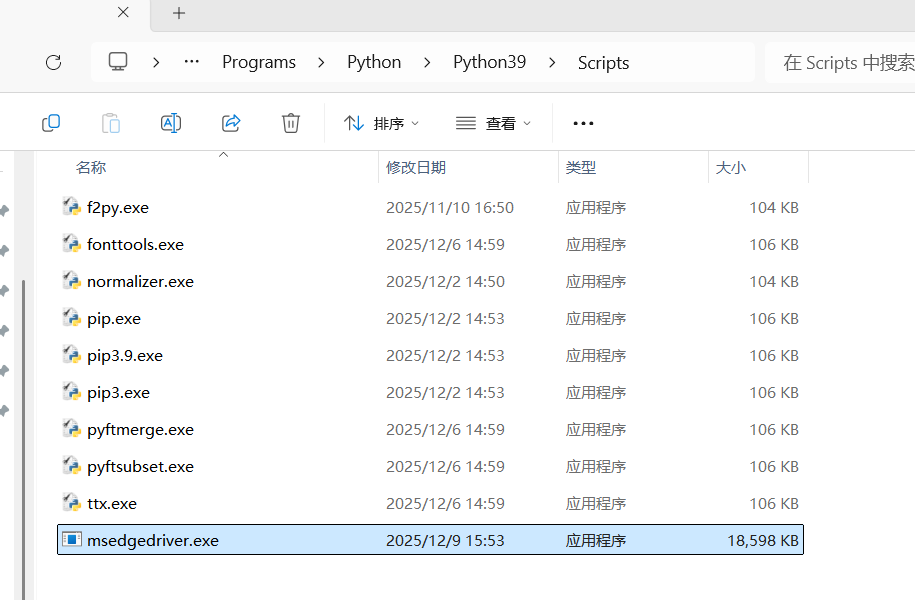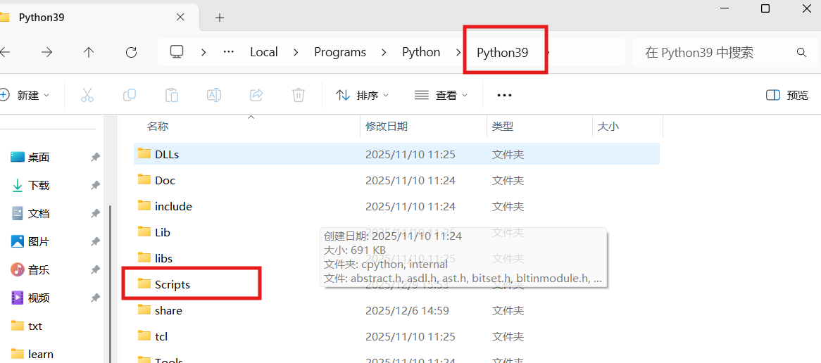 注意在文件管理器中查找的时候要把python.exe去掉,回车,在这里会有一个scripts文件夹,点开该文件夹