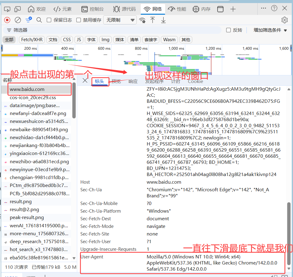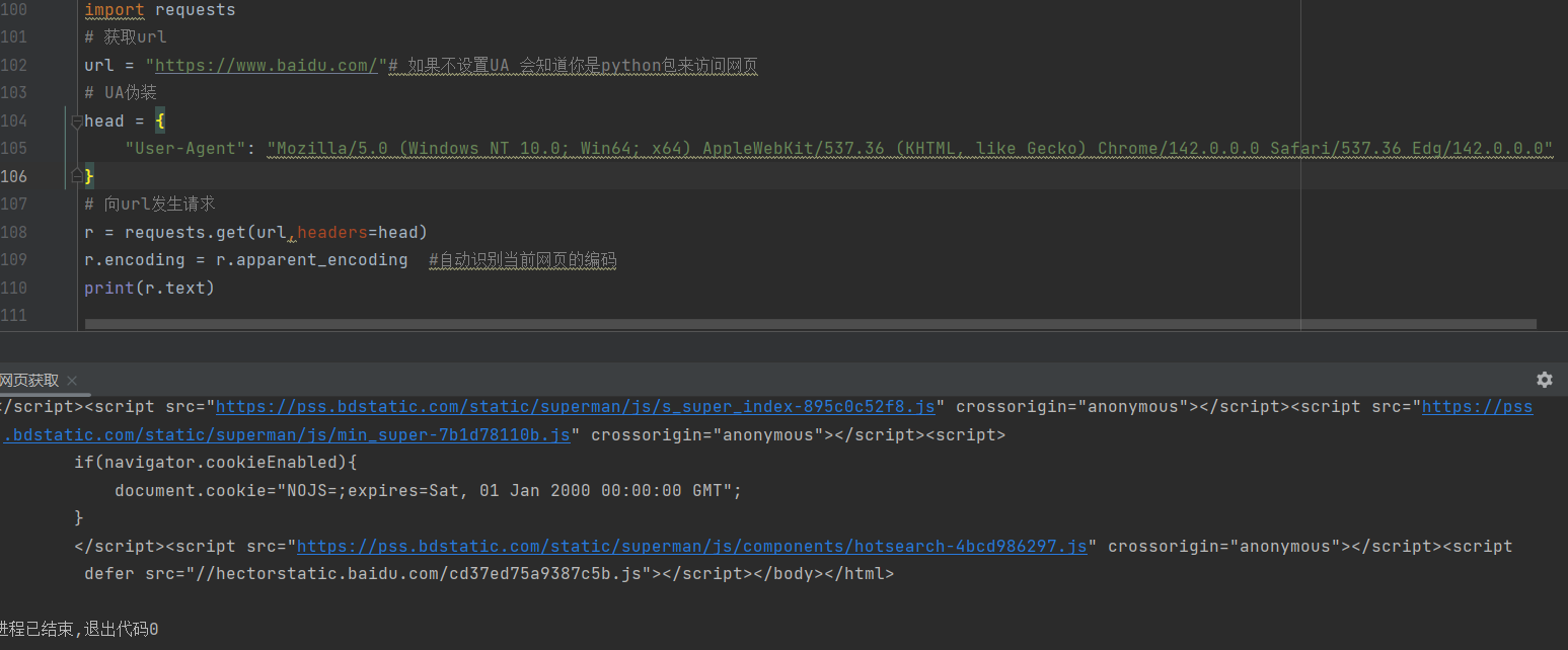 向网站发送访问请求的时候网站服务器会先判断访问是否合理,合理会返回状态码和返回信息,不合理就会返回异常状态码。params参数会以字典形式在url后自动添加信息,需要提前将params定义为字典,建立字典info,包含一个键值对,get函数获取网页,该使用形式便于灵活设定需要搜索的信息。此时我们会发现并没有输出我们需要的信息,我们这时候不是以一个用户的身份进行访问的,可以进行UA伪装,伪装成用户再