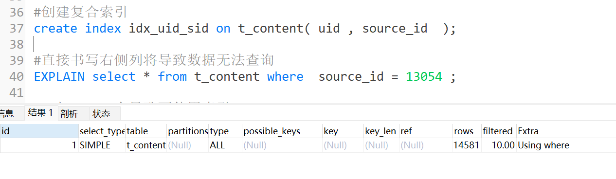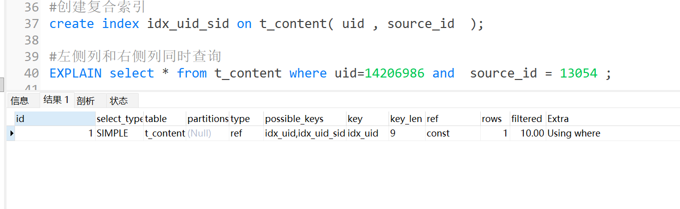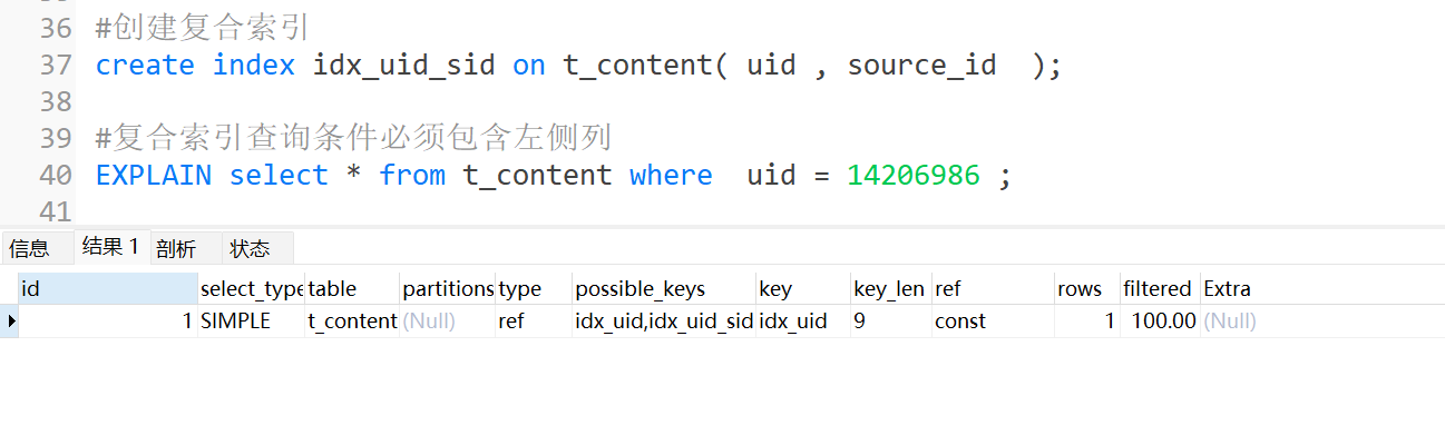 在上面的示例中,复合索引包含了两个字段,uid和source_id,uid在第一位,source_id在第二位。