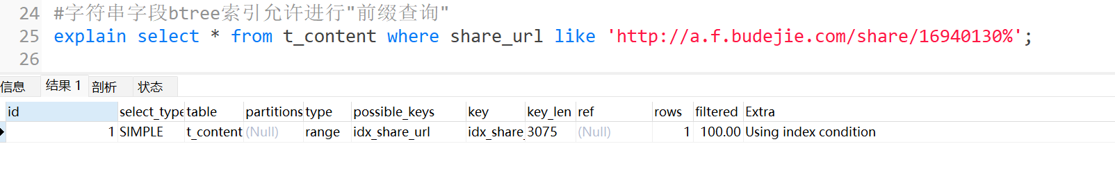 当使用like做模糊检索时,如果模糊检索的字符串,前面没有%,后面使用了%,这种情况也是可以用到索引。