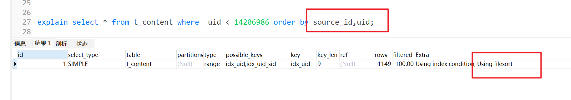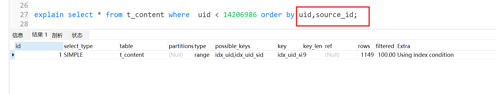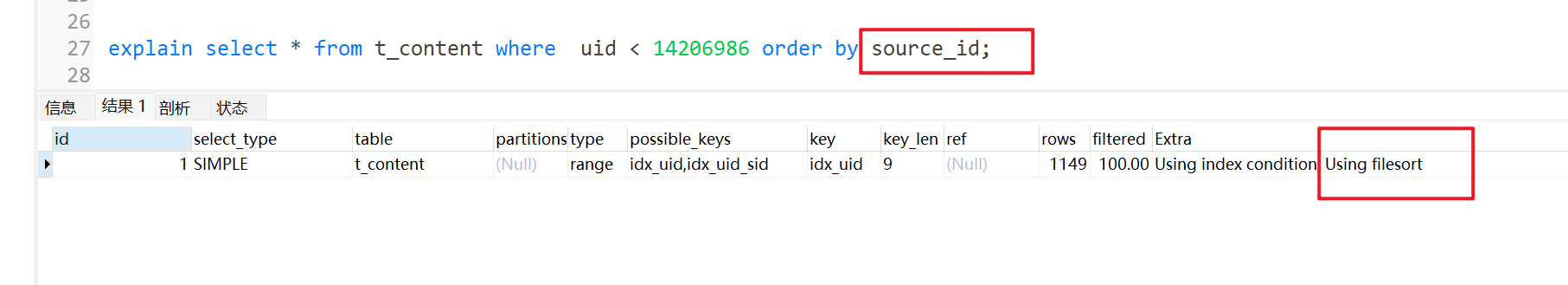 在上面的语句中,uid和source_id字段组成了复合索引,uid是索引的左侧字段,当使用order by进行排序时,如果source_id(索引右侧列)在前面,不会使用索引,排序就是Using filesort方式,比较慢的排序方式。