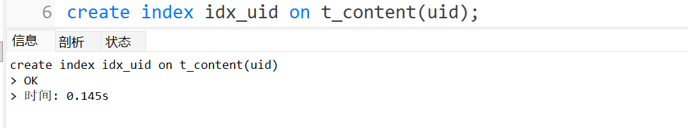 上面的语句表示在t_content表的uid字段上添加索引,索引的名称为idx_uid。