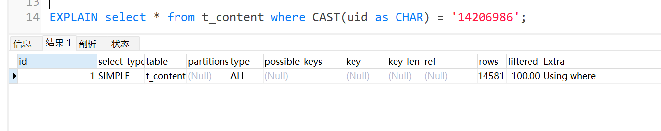 uid字段上面,已经创建了索引,但是用CAST函数对字段值进行处理,查询时,就不会用到索引。