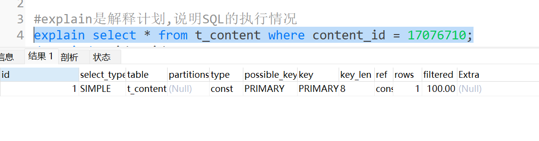 可以看到上面的结果中,key字段值为PRIMARY,是用到了主键索引。