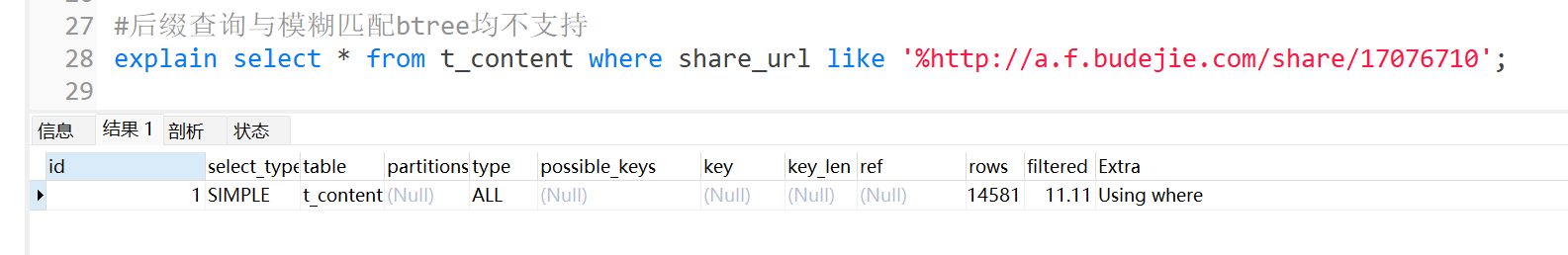 在like查询中,字符串开头使用了%,这种情况索引会失效。
