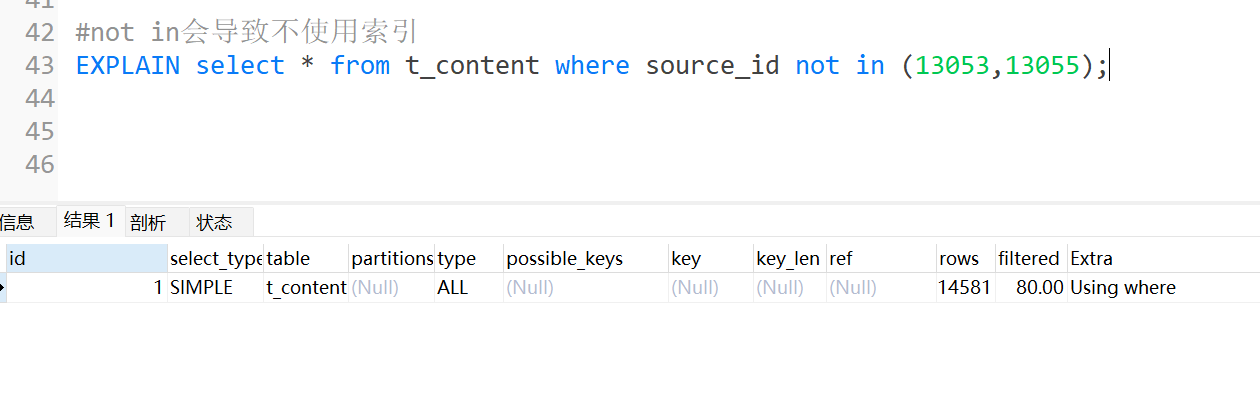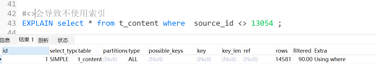 当type值为ALL时,表示全表扫描,没有使用任何索引。