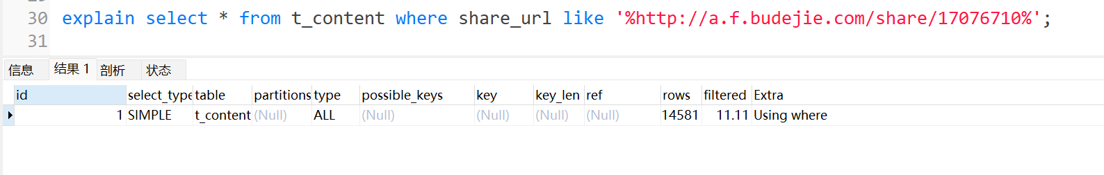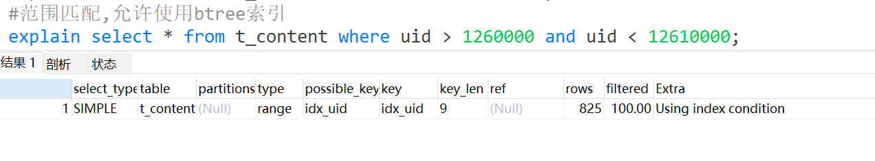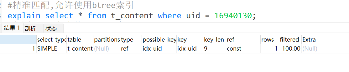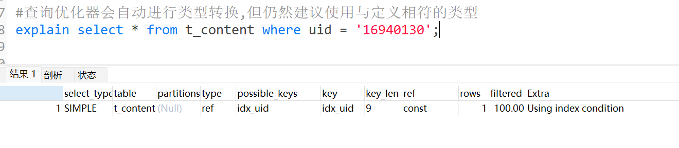 这种情况,虽然执行计划显示用到了索引,但是不推荐这样写法,因为uid是bigint类型,转成字符串,本身就会消耗资源,降低查询速度。最好的做法就是查询条件与定义相符的类型。