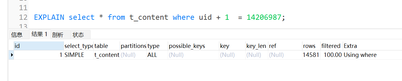 uid字段上面,已经创建了索引,但是用运算后,查询时,就不会用到索引。